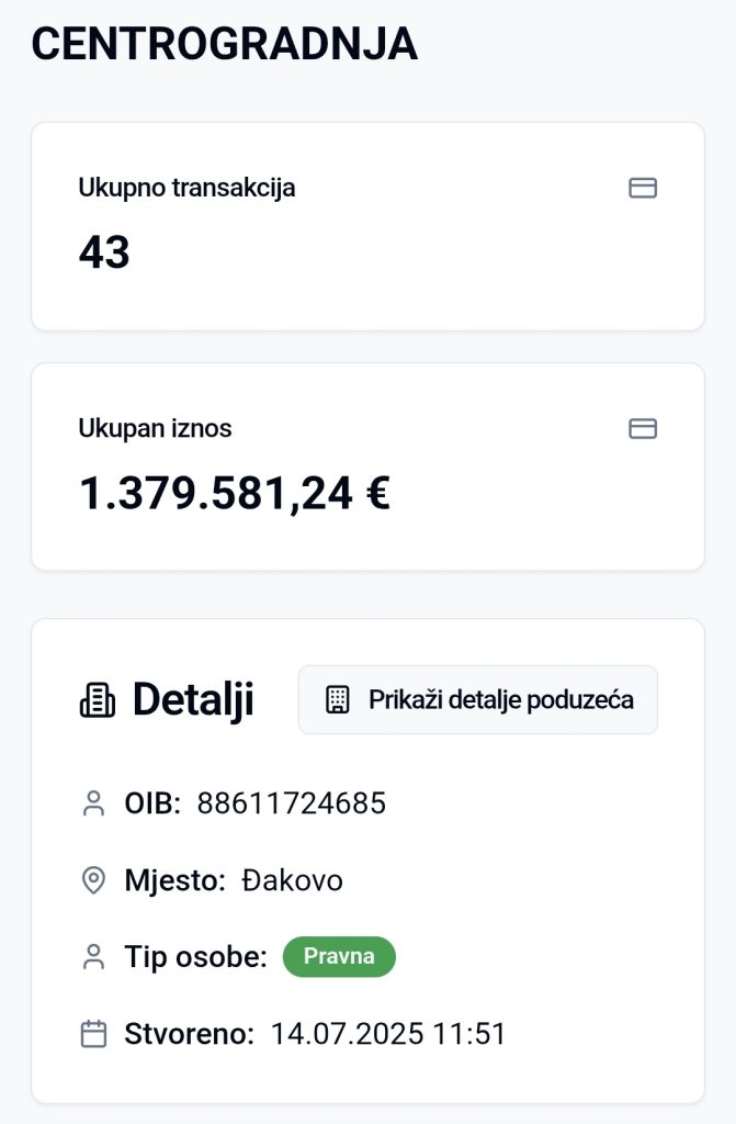 Prema službenim podacima iz e-Transparentno, Grad Đakovo je u samo 22 mjeseca (2024. – srpanj 2025.) isplatio tvrtki Centrogradnja d.o.o. Đakovo, u vlasništvu Antonija Ivančića, ukupno 1.379.581,24 eura kroz 43 transakcije.