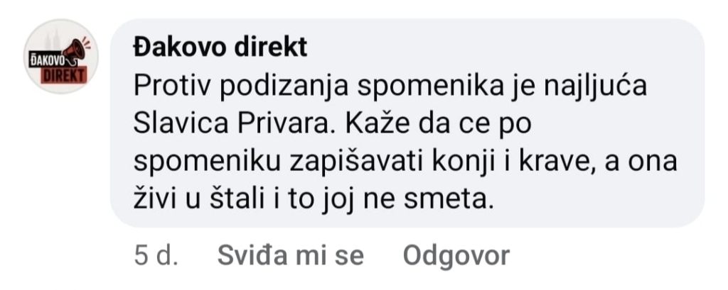 Komentar je glasio: „Protiv podizanja spomenika je najljuća Slavica P. Kaže da će po spomeniku zapišavati konji i krave, a ona živi u štali i to joj ne smeta.“