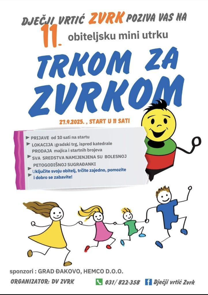 Danas, 27. rujna 2025., na Strossmayerovom trgu ispred Katedrale, Dječji vrtić Zvrk još je jednom dokazao da građanske inicijative, koje se vode srcem i bez stranačkih kalkulacija, imaju snagu pokrenuti cijelu zajednicu. Jedanaestu godinu zaredom organizirali su obiteljsku miniutrku „Trkom za zvrkom“, a odziv djece, roditelja i građana ponovno je bio sjajan. Od samih prijava u 10 sati do zadnjeg pljeska nakon starta u 11, grad je bio ispunjen veseljem, smijehom i humanitarnim duhom – jer sav prihod od startnina i majica ide za pomoć bolesnoj petogodišnjoj sugrađanki.