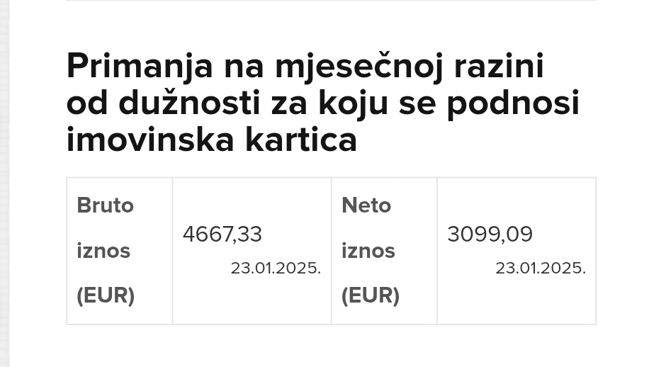 A u imovinskoj kartici – jasno piše: Bruto 4.667,33 €, neto 3.099,09 € mjesečno.